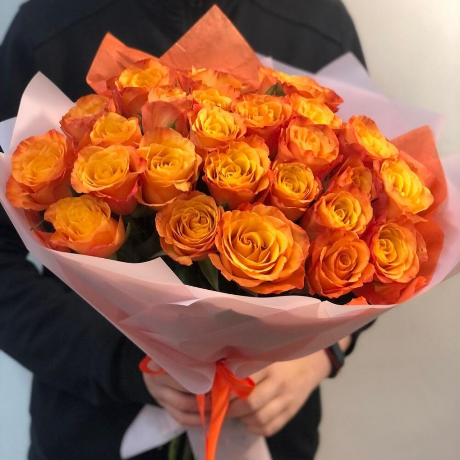 На фото букет из 25 оранжевых роз. В составе: роза 25 шт, дизайнерская упаковка 1 шт, атласная лента 1 шт, . Все цветы свежие и ароматные, букет красиво оформлен и отлично подходит для подарка. Доступна доставка цветов или самовывоз.
