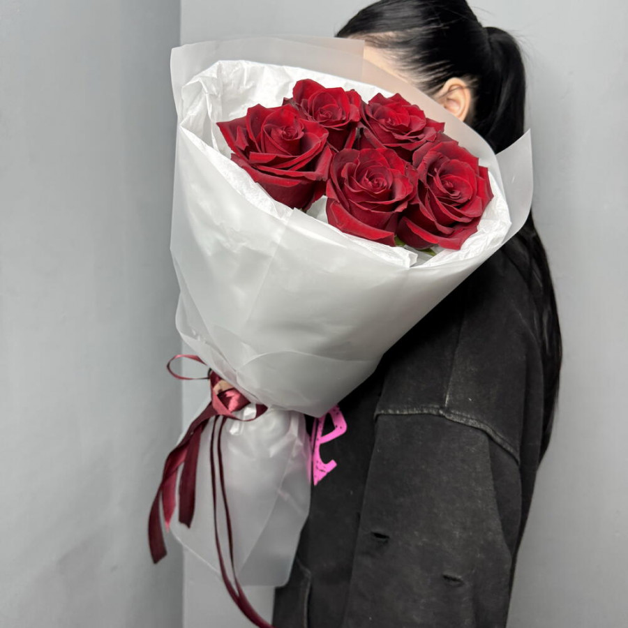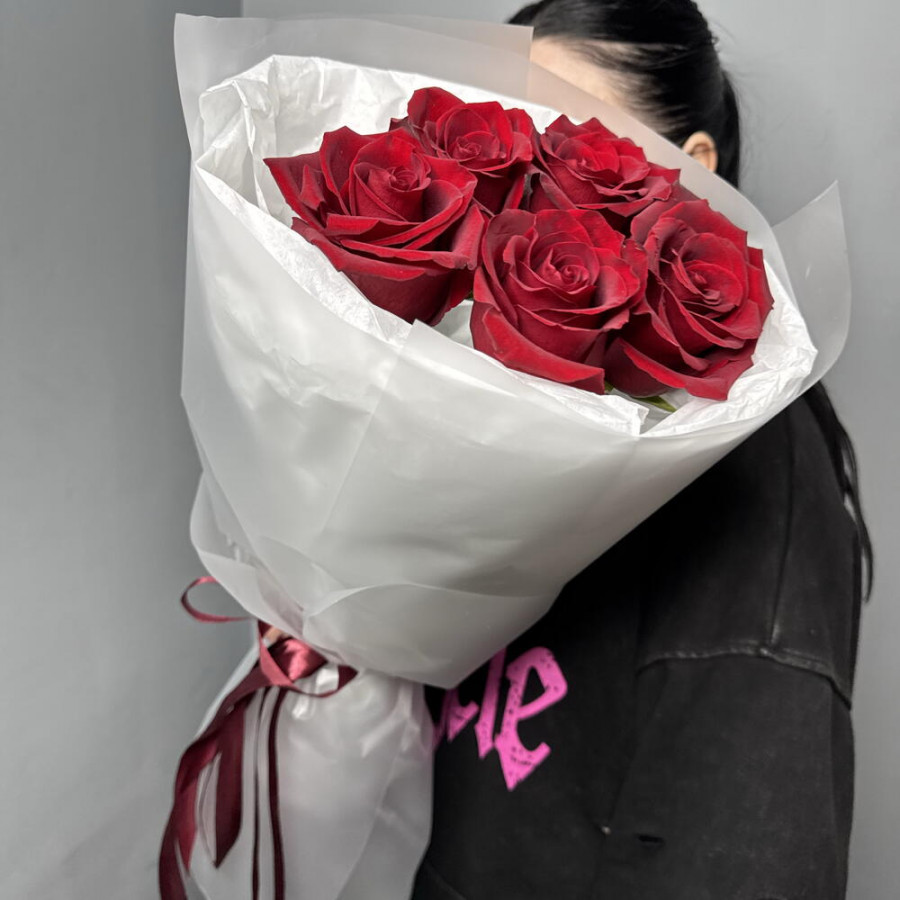 На фото букет из 5 бордовых роз. В составе: роза 5 шт, дизайнерская упаковка 1 шт, атласная лента 1 шт, . Все цветы свежие и ароматные, букет красиво оформлен и отлично подходит для подарка. Доступна доставка цветов или самовывоз.