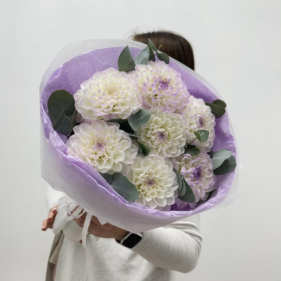 На фото букет из 7 бело-лиловых георгин с эвкалиптом. В составе: георгина 7 шт, эвкалипт 3 шт, дизайнерская упаковка 1 шт, атласная лента 1 шт, . Все цветы свежие и ароматные, букет красиво оформлен и отлично подходит для подарка. Доступна доставка цветов или самовывоз.