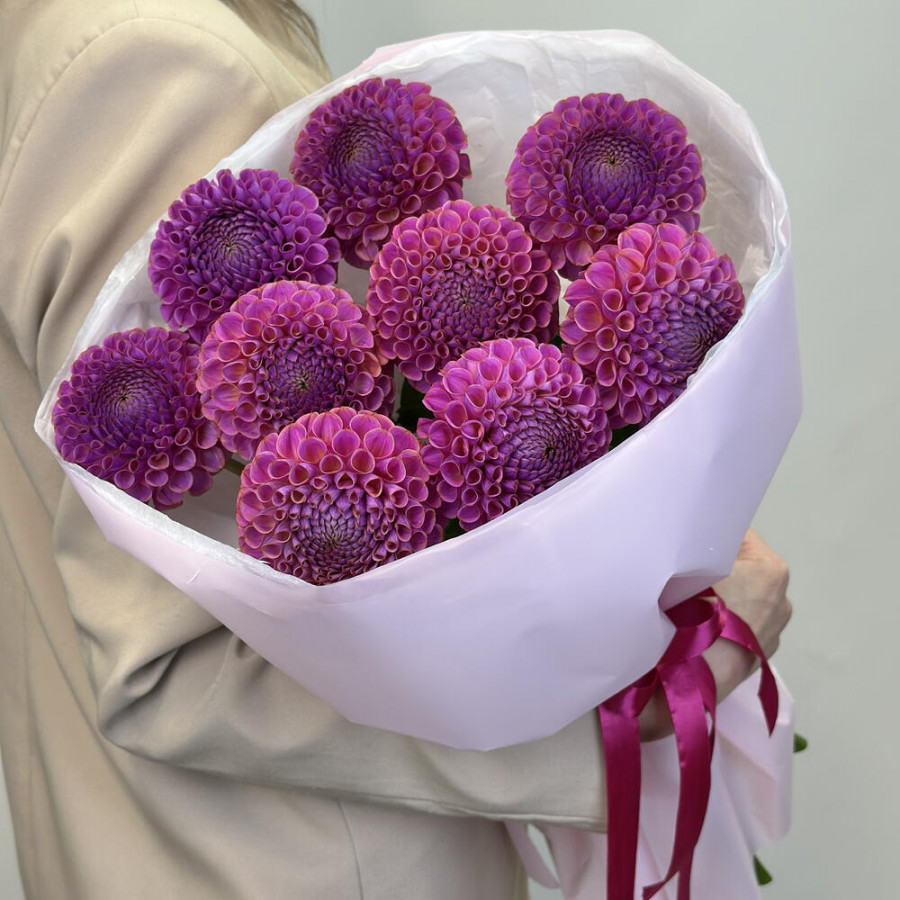 На фото букет из 9 фиолетовых георгин. В составе: георгина 9 шт, дизайнерская упаковка 1 шт, атласная лента 1 шт, . Все цветы свежие и ароматные, букет красиво оформлен и отлично подходит для подарка. Доступна доставка цветов или самовывоз.