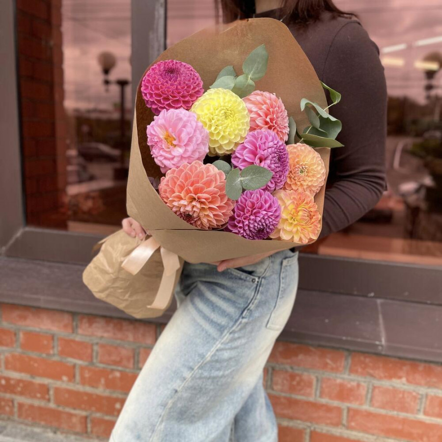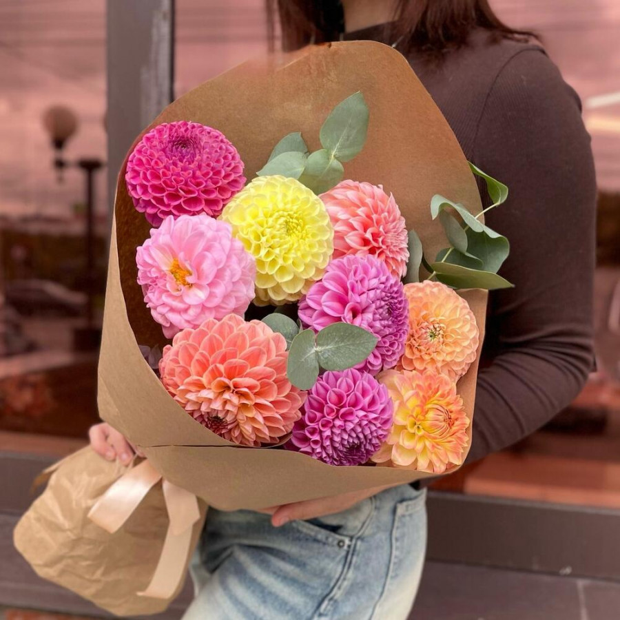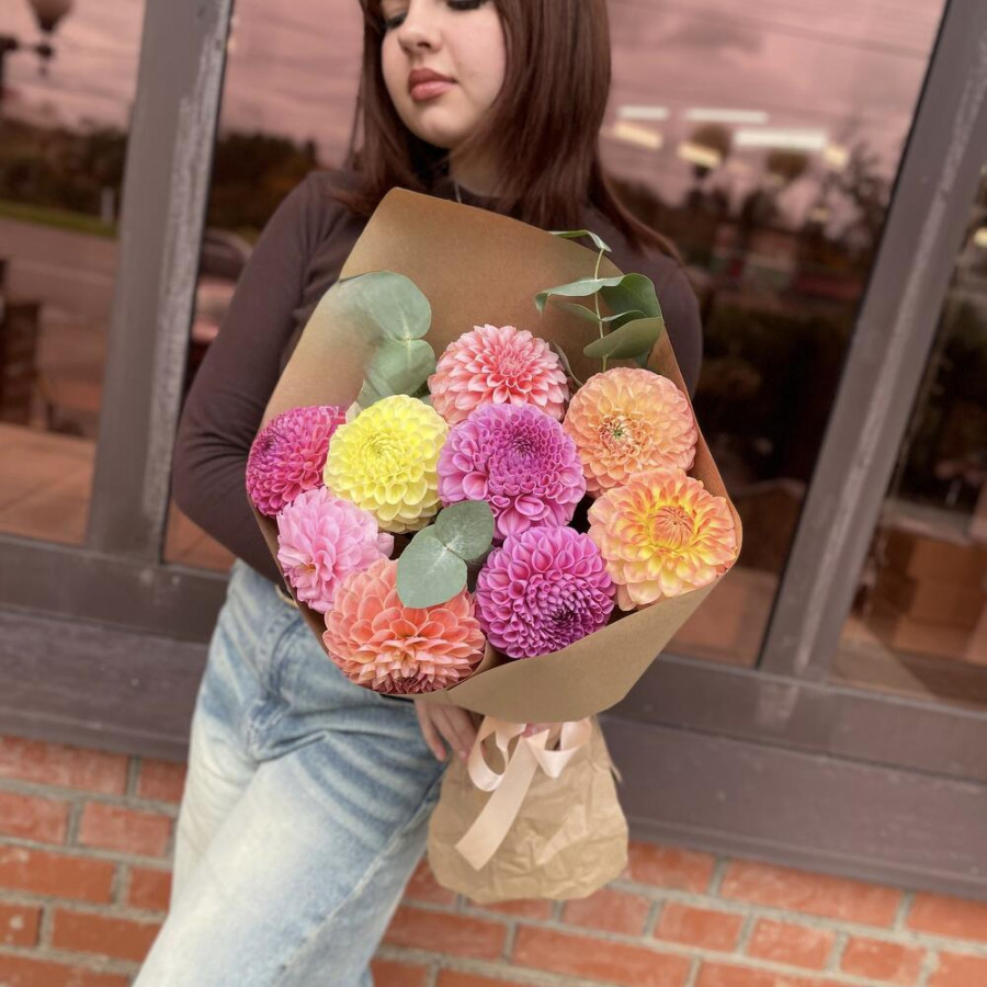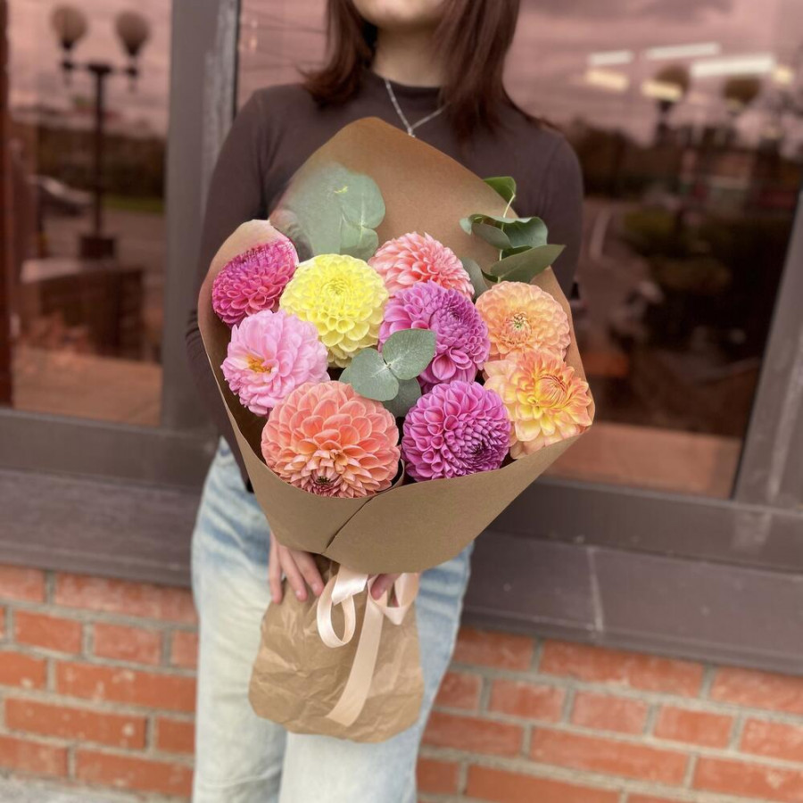 На фото букет «фестиваль цвета». В составе: георгина 9 шт, эвкалипт 2 шт, крафт-бумага 1 шт, атласная лента 1 шт, . Все цветы свежие и ароматные, букет красиво оформлен и отлично подходит для подарка. Доступна доставка цветов или самовывоз.