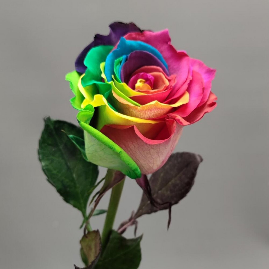 На фото радужная роза 1 штука. В составе: роза 1 шт, . Все цветы свежие и ароматные, букет красиво оформлен и отлично подходит для подарка. Доступна доставка цветов или самовывоз.